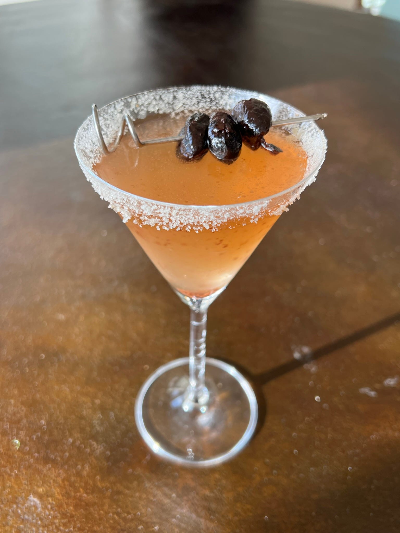 GARNISH: truffle salt rimmed on glass + 3 dry cured olives