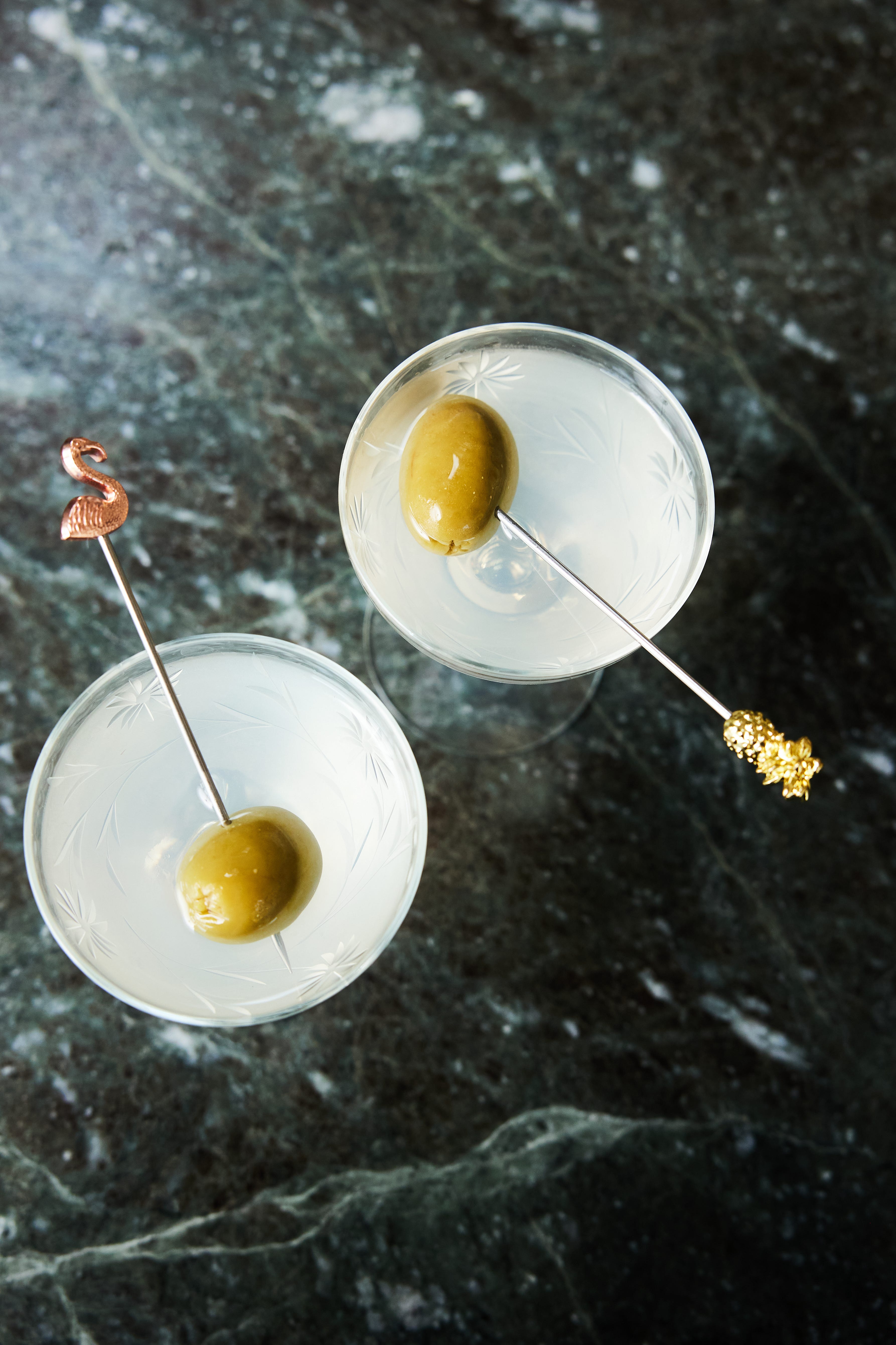 To a cocktail shaker add all ingredients and then fill with ice. Stir 50 times. Strain into cocktail glasses, add olives or other garnish, and serve.